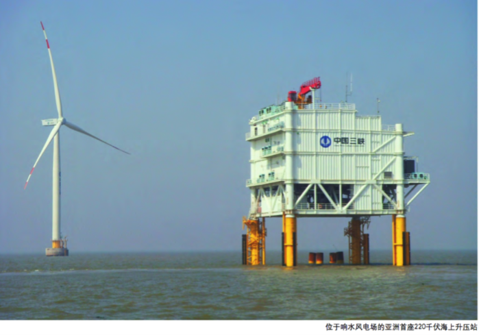 由于海上升壓站比較復(fù)雜,總重量很大,一般采用在陸地上整體建造,再由工程船運到海上一體化安裝的操作模式。以響水海上風(fēng)電場的海上升壓站為例,上部平臺分4層,主體平面尺寸約25米×28位于響水風(fēng)電場的亞洲首座220千伏海上升壓站米,高約25米,總重約2000噸。
