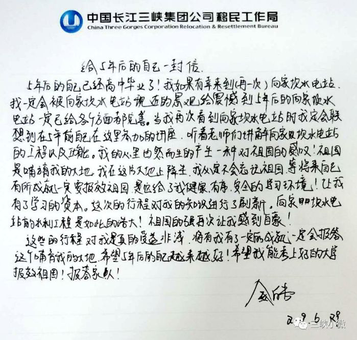 參加此次活動(dòng)的50名中學(xué)生,正值愛做夢(mèng)的年紀(jì),理想的種子正在萌芽。為了激發(fā)他們?yōu)槔硐氩恍笂^斗的熱情,志愿者組織同學(xué)們給五年或十年后的自己寫一封信,對(duì)話未來(lái)的自己,規(guī)劃自己的未來(lái)。這一環(huán)節(jié)中,岳子豪同學(xué)作為參加過(guò)往屆娃娃行活動(dòng)的學(xué)生代表做了發(fā)言:“是向家壩電站建設(shè)的叔叔阿姨用辛勤的汗水換來(lái)了我們今天的幸福!我一定要努力學(xué)習(xí),將來(lái)也要成為一名水電建設(shè)者,為祖國(guó)作貢獻(xiàn)!”