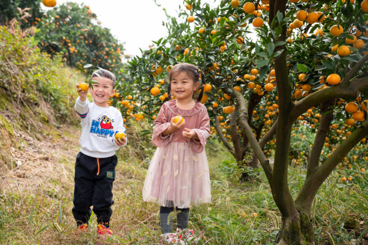 柑橘園里,孩子們正在采摘柑橘 天平山村村委會提供
