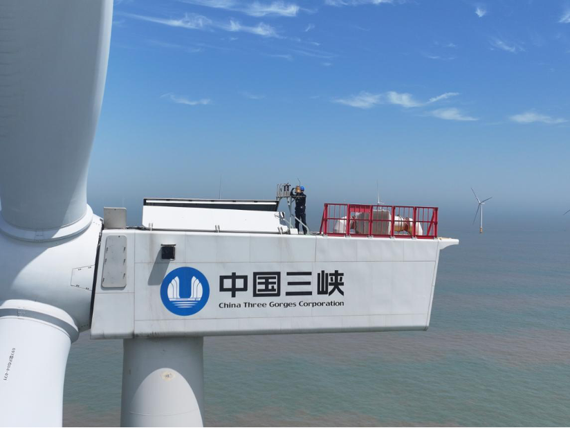 ▲巡檢人員在百米高的風機頂部開展工作 江蘇運維公司供圖