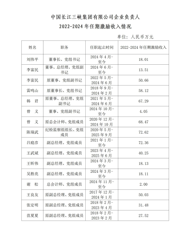 中國長江三峽集團有限公司企業負責人2022-2024年任期激勵收入情況