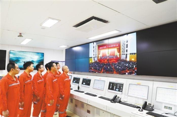 “深海一號”氣田員工在中控室觀看黨的二十大開幕會直播。中國海油供圖