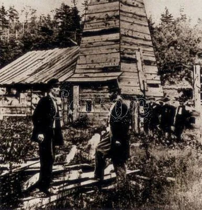 ▲19世紀(jì),德雷克上校(戴高帽者)在賓夕法尼亞州的泰斯維爾。1859年,德雷克在泰斯維爾開掘出世界第一口油井? ?文化傳播 FOTOE-10234126