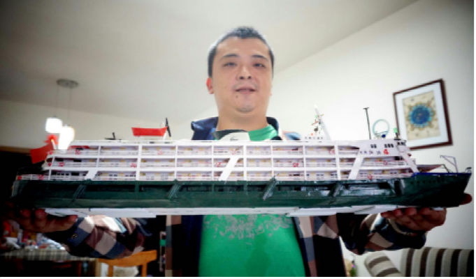 ▲?長(zhǎng)江船舶愛好者王軒和他制作的“江渝4”號(hào)客輪模型。此船換色改名后,現(xiàn)收藏于奉節(jié)縣詩(shī)城博物館