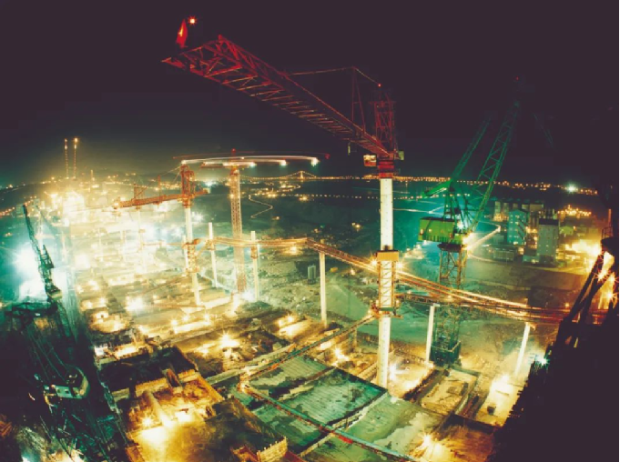 ▲?1999年除夕夜,三峽工程施工現場燈火通明,奮戰正酣。(資料圖片)