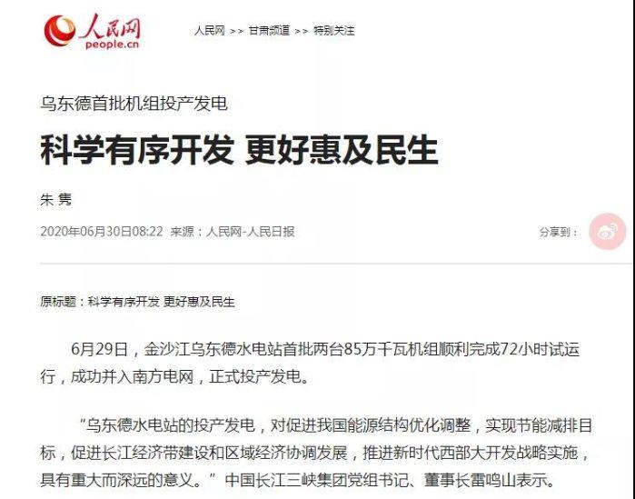 【人民網(wǎng)】烏東德首批機(jī)組投產(chǎn)發(fā)電:科學(xué)有序開發(fā) 更好惠及民生